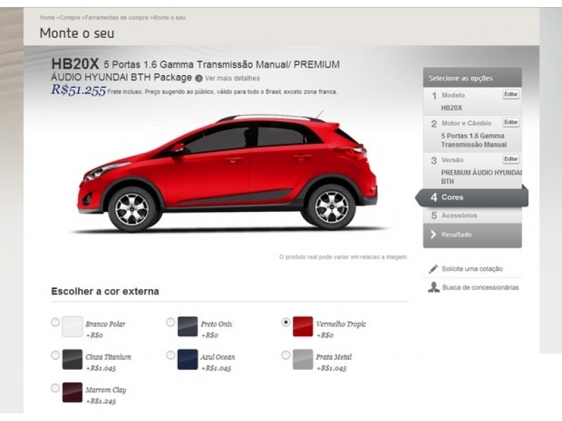 Às vésperas da sua estreia na rede de concessionárias da Hyundai, o pseudo-aventureiro HB20X já pode ser configurado no site brasileiro da montadora. No entanto, você não encontrará o local de configuração logo de cara no portal, é preciso fazer alguns truques para chegar ao configurador do modelo, substituindo o nome “HB20” no link da área de apresentação do compacto em suas versões convencionais pelo “HB20X”.